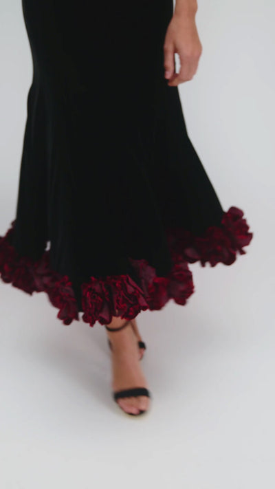 Black velvet gown with an off-shoulder neckline and a fitted silhouette. The skirt flares towards the hem, adorned with voluminous velvet roses crafted by hand. The contrast between the pared-back bodice and the decorative finish creates a striking accent, underscoring the couture character of the piece.