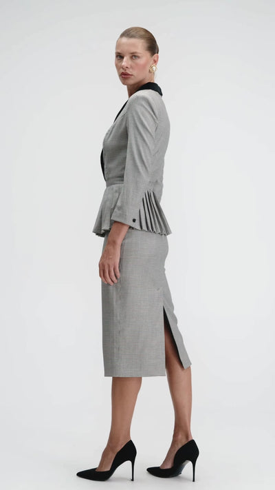 Dress in suiting wool, cut in the style of a double-breasted jacket with a pencil skirt. A velvet collar creates a striking contrast of textures, while a pleated peplum defines the waist. The fitted silhouette and midi length highlight the classic proportions.