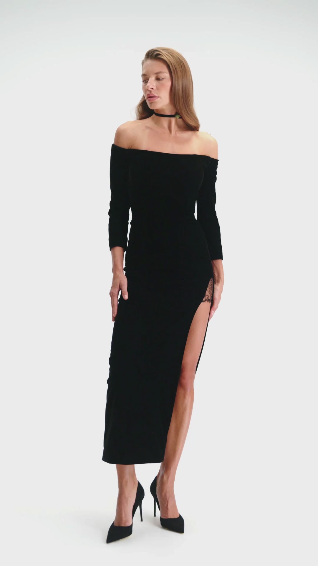 A floor-length gown in black velvet with an off-shoulder neckline. The fitted silhouette accentuates the body, while a high slit lends movement and energy. The fabric’s rich texture enhances the depth of color and sharpness of form.